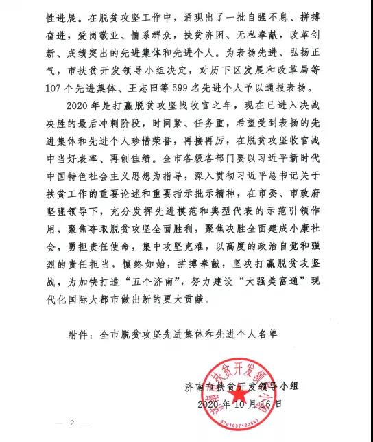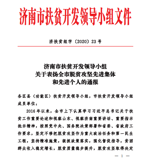 近日,濟南市扶貧開發(fā)領(lǐng)導(dǎo)小組發(fā)布《濟南市扶貧開發(fā)領(lǐng)導(dǎo)小組關(guān)于表揚全市脫貧攻堅先進集體和先進個人的通報》,長田實業(yè)董事長張勇榮獲全市“脫貧攻堅先進個人”榮譽稱號。
