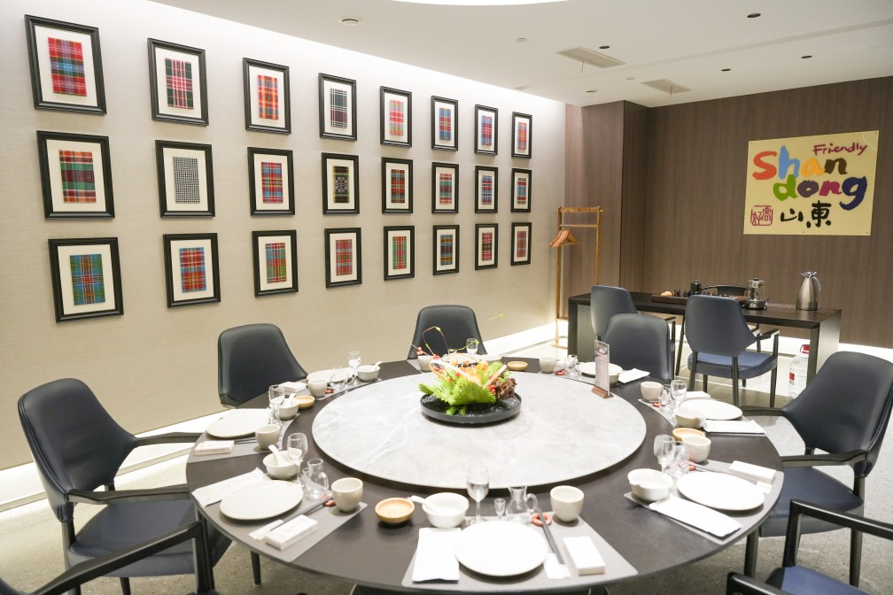 獨具匠心之處在于,一品黃河20個包間以黃河所流經(jīng)的九個省份和進(jìn)入山東省后所流經(jīng)的九個市的名稱命名,房間內(nèi)軟裝如掛畫等體現(xiàn)沿黃省份、城市的文化特征,并通過桌卡形式全面呈現(xiàn)文化內(nèi)涵,將黃河文化具象為沉浸式餐飲體驗。比如山東廳懸掛的是山東具有代表性的非遺文化代表作--魯錦,魯錦的每一梭都是對自然的敬畏,每一紋都是對生活的期許;黃河源頭青海廳懸掛的是青海省具有代表性的非遺文化代表作熱貢唐卡;四川廳懸掛的是四川具有代表性的非遺文化代表作蜀繡做成的熊貓壁畫;有“天下黃河富寧夏”之說的寧夏廳,懸掛的是寧夏最具代表性的非遺文化產(chǎn)品回民剪紙等等。讓每一餐都成為一場文化之旅。