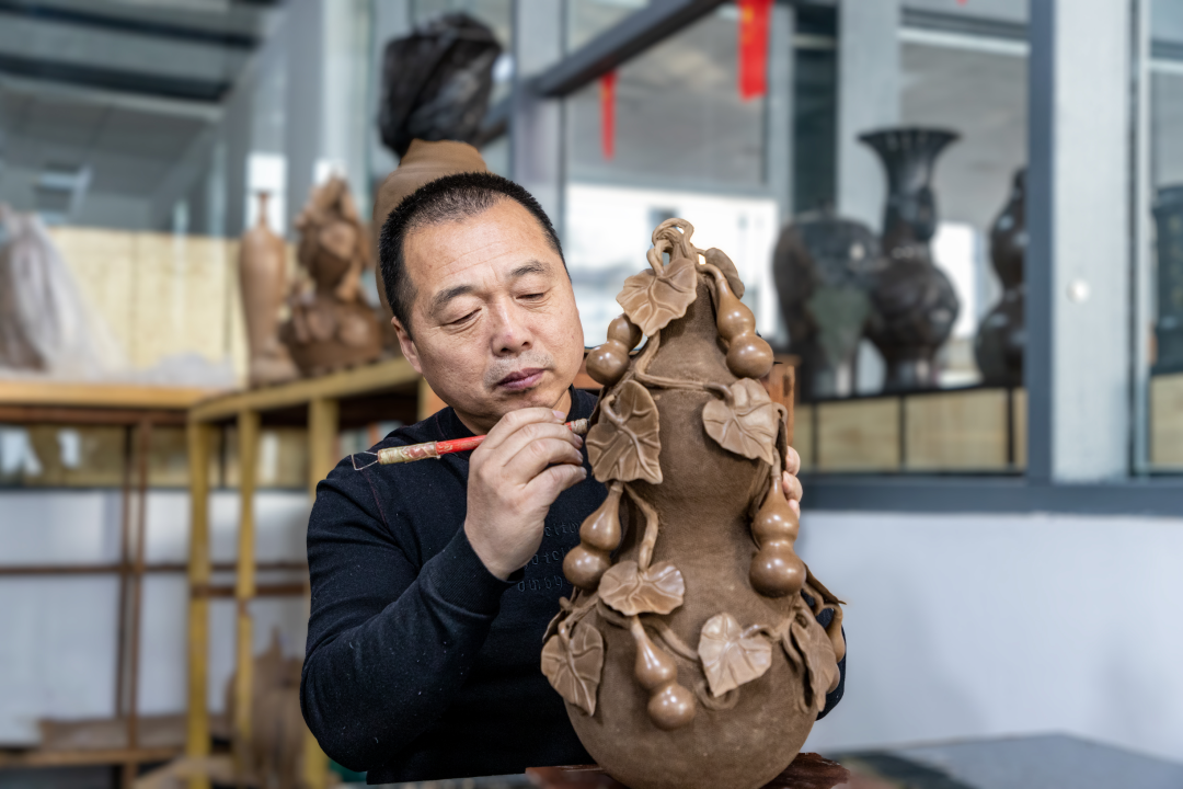 黑陶是華夏先民的黑色詩篇,作為土生土長的濟陽人,三十余載光陰里,徐慶增潛心研究黑陶,續(xù)寫這光輝的詩篇。如今,他的作品早已超越實用范疇,成為兼具藝術價值與文化厚度的非遺名片?!洱堯v盛世》以華夏龍為魂,將泥與火的淬煉推向極致?!陡酆J》造型圓潤飽滿,釉色沉郁如墨玉,無需多言,一抹玄色間,福氣已悄然落定?!豆淖友砀琛穭t將田間地頭的歡騰瞬間凝固于陶面,讓人仿佛聽見咚咚的鼓點,看見祖輩們在黃河邊舞出的煙火人間。這些凝聚著心血的創(chuàng)作,不僅是他個人的藝術成就,更成為高校非遺教學中鮮活的教材。
